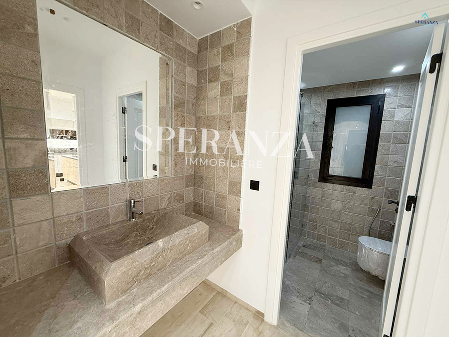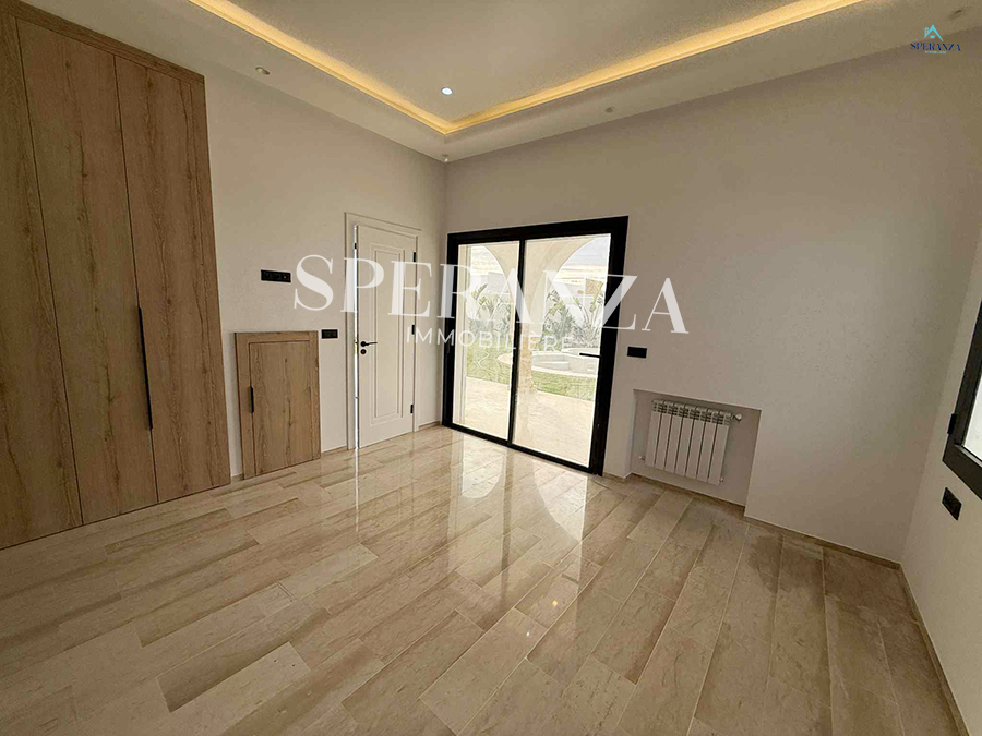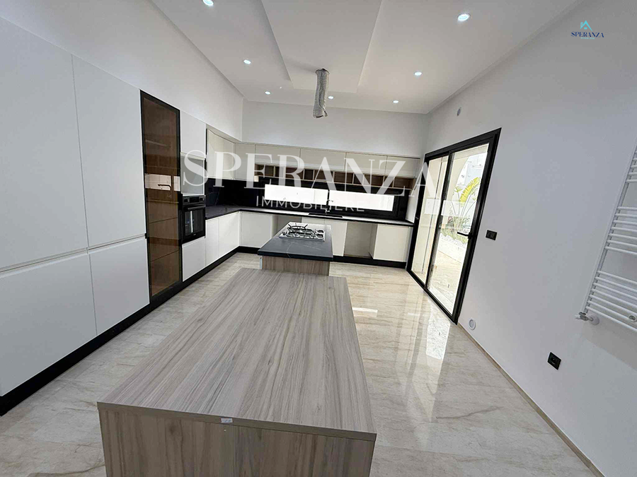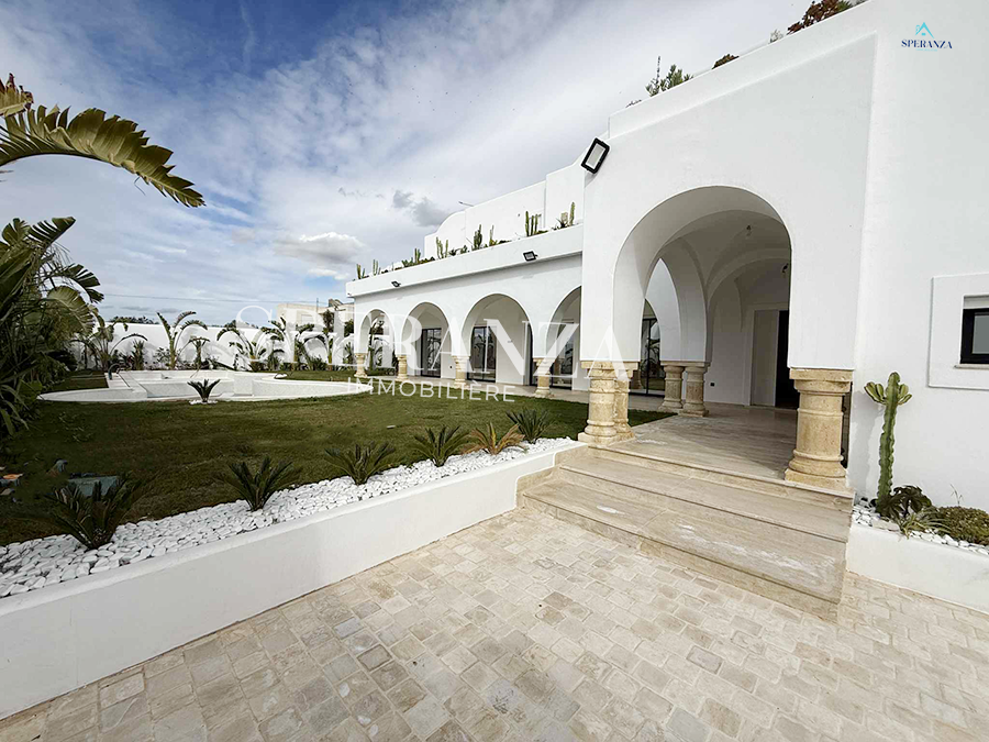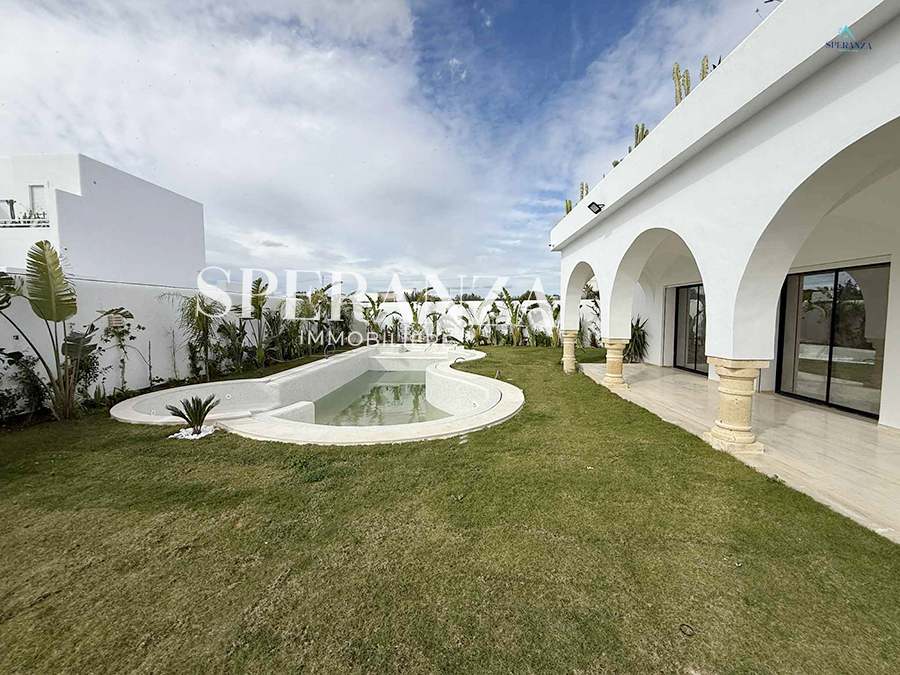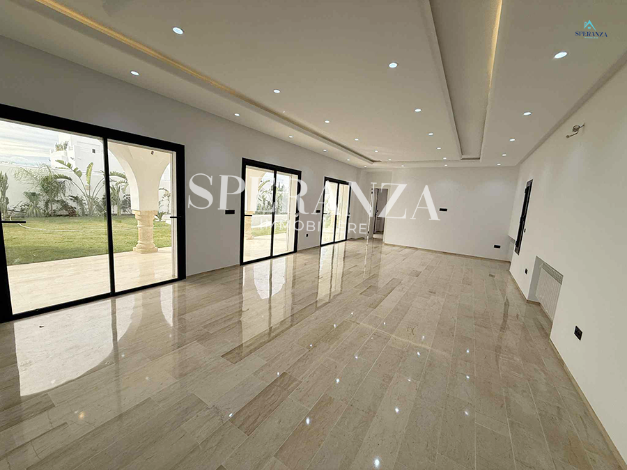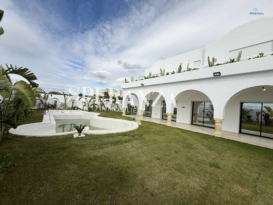 Speranza immobilière Hammamet vous propose à la vente Cette villa se situé à Hammamet Sud . L'entrée bénéficie d'un jardin gazonné avec un piscine. La partie jour est composée principalement d'un salon lumineux grâce à ses fenêtre qui offre une vue sur le jardin ,salon séjour, une cuisine dispose de plusieurs éléments de rangement ,une salle d’eau pour les invités,une suite parentale . Un escalier nous mène au 1ér étage à la partie nuit qui se compose par trois suites parentales avec terrasse qui offre une vue sur le jardin et piscine ,et un garage .